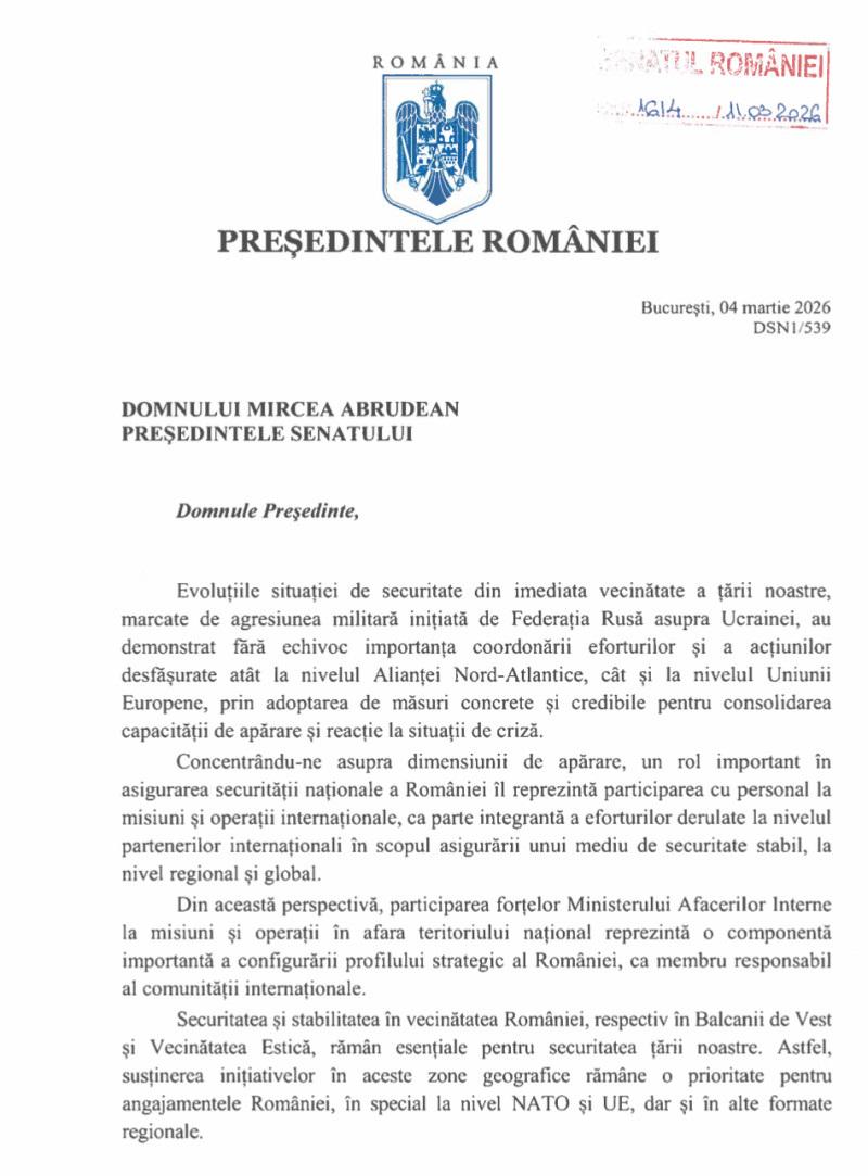 O altă scrisoare transmisă de președinte către Parlament se referă la aprobarea participării forțelor Ministerului Afacerilor Interne la misiuni în afara țării în 2026.