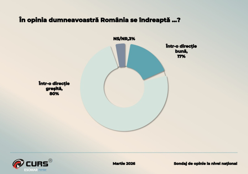 La întrebarea privind direcţia în care se îndreaptă România, 80% dintre cei chestionaţi au răspuns că lucrurile merg într-o direcţie greşită, în timp ce doar 17% spun că direcţia este bună.