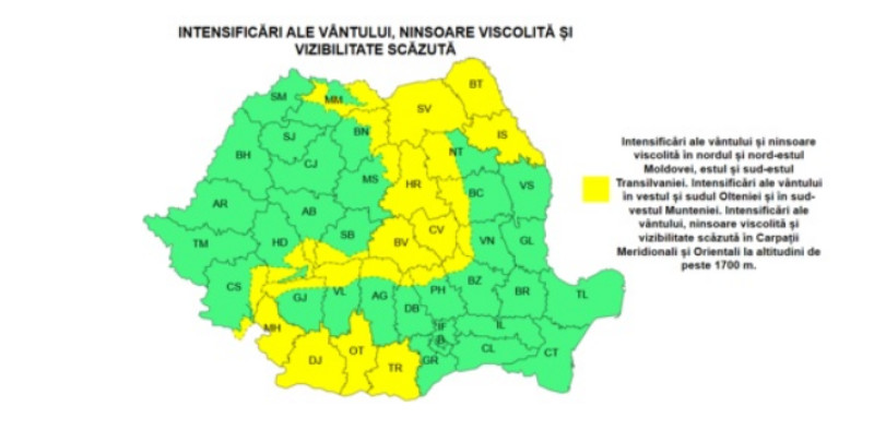 Miercuri, până la ora 20:00, în nordul și nord-estul Moldovei, estul și sud-estul Transilvaniei, vor fi intensificări ale vântului cu viteze de 50…70 km/h și va ninge viscolit. Intensificări ale vântului vor fi și în vestul și sudul Olteniei și în sud-vestul Munteniei, cu rafale de 50…70 km/h. În Carpații Meridionali și Orientali vor fi viteze de 60…85 km/h, iar la altitudini de peste 1700 m, rafalele vor atinge 90…120 km/h, ninsoarea va fi viscolită, iar vizibilitatea se va menține scăzută.