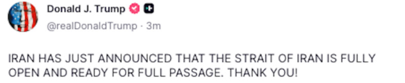„Iranul tocmai a a anunţat că Strâmtoarea Ormuz este deschisă în întregime şi pregătită de o traversare completă. mulţumesc”, scrie pe platforma Truth Social, cu majuscule, şeful statului american.