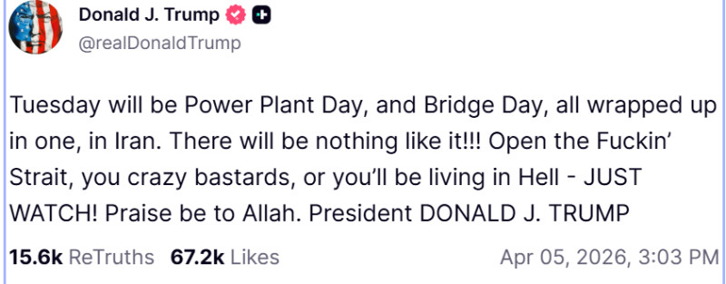 Trump a promis pe rețelele sociale că va lovi centralele electrice și podurile Iranului și a spus că țara va „trăi în iad” dacă strâmtoarea Ormuz – crucială pentru comerțul global – nu va fi deschisă. El a încheiat cu „Lăudat fie Allah”.