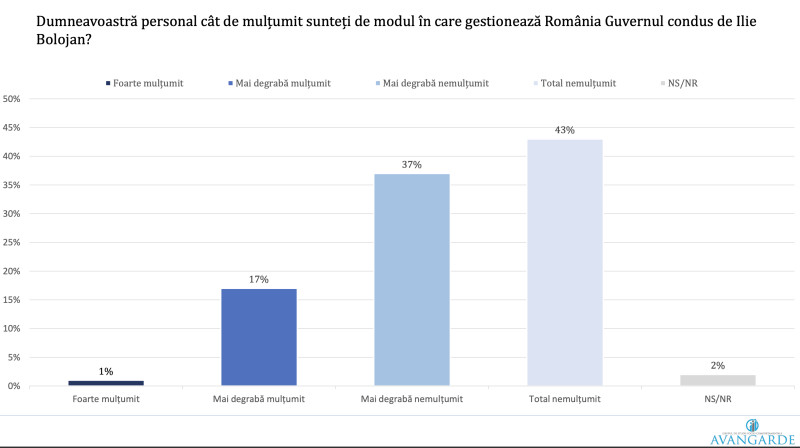 Cei mai mulți români sunt total nemulțumiți de modul în care guvernul condus de llie Bolojan gestionează România, cu un procent de 43%. 37% dintre români sunt mai degrabă mulțumiți, 17% se declarată mulțumiți de gestionarea guvernului și doar 1% sunt foarte mulțumiți.