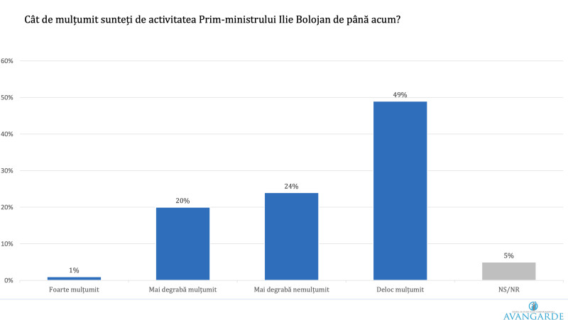 De asemenea, 49% dintre români se declară nemulțumiți de activitatea premierului de până acum. În timp ce 24% se poziționează ca fiind „mai degrabă nemulțumit”, 20% se declară mulțumiți și doar 1% se încadrează la foarte mulțumiți.