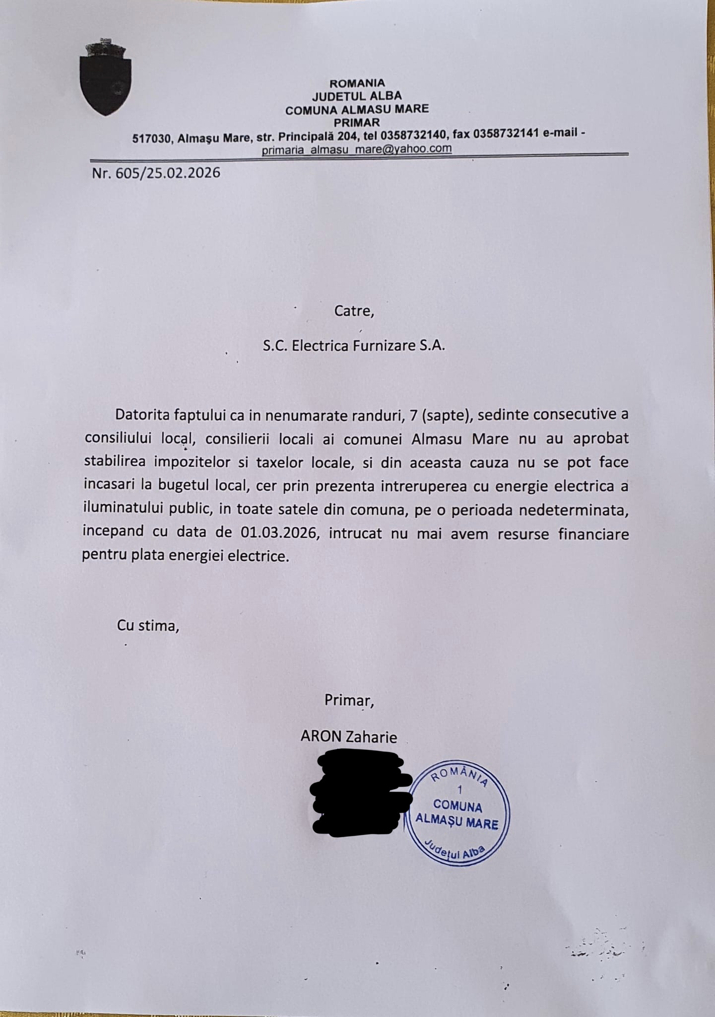 „Datorită faptului că în nenumărate rânduri, 7 ședințe consecutive ale consiliului local, consilierii locali ai comunei Almașu Mare nu au aprobat stabilirea impozitelor și taxelor locale, și din această cauză nu se pot face încasări la bugetul local, cer prin prezenta întreruperea cu energie electrică a iluminatului public, în toate satele din comună, pe o perioadă nedeterminată, începând cu data de 01.03.2026, întrucât nu mai avem resurse financiare pentru plata energiei electrice”, se arată în solicitarea transmisă de edil.